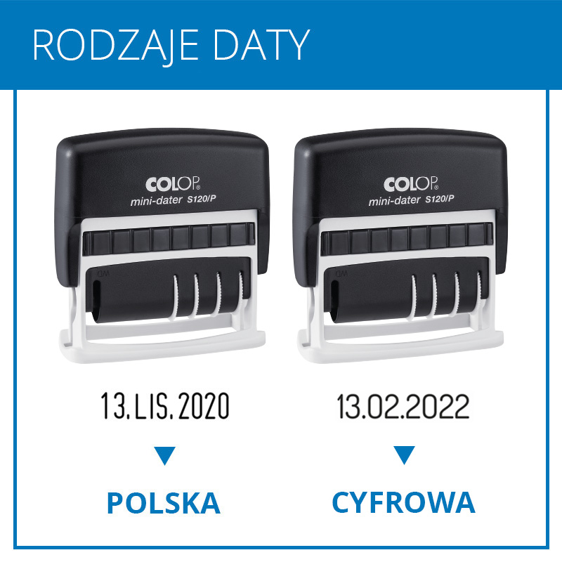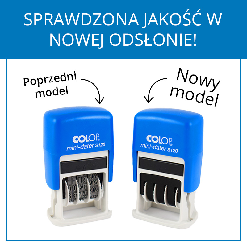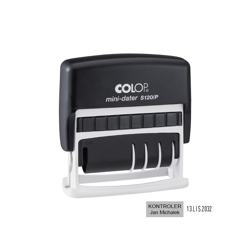 Datownik S120/P charakteryzuje poręczna forma i lekka obudowa. Format daty dostępny jest w wariancie polskim i cyfrowym. Data znajduje się po prawej stronie, a po lewej jest miejsce na treść. Datownik charakteryzuje się prostym systemem wymiany poduszki, co dodatkowo wpływa na wygodę obsługi. Gumowe paski zasłonięte są plastikową osłoną, dzięki czemu ryzyko zabrudzenia tuszem zostaje wyeliminowane.