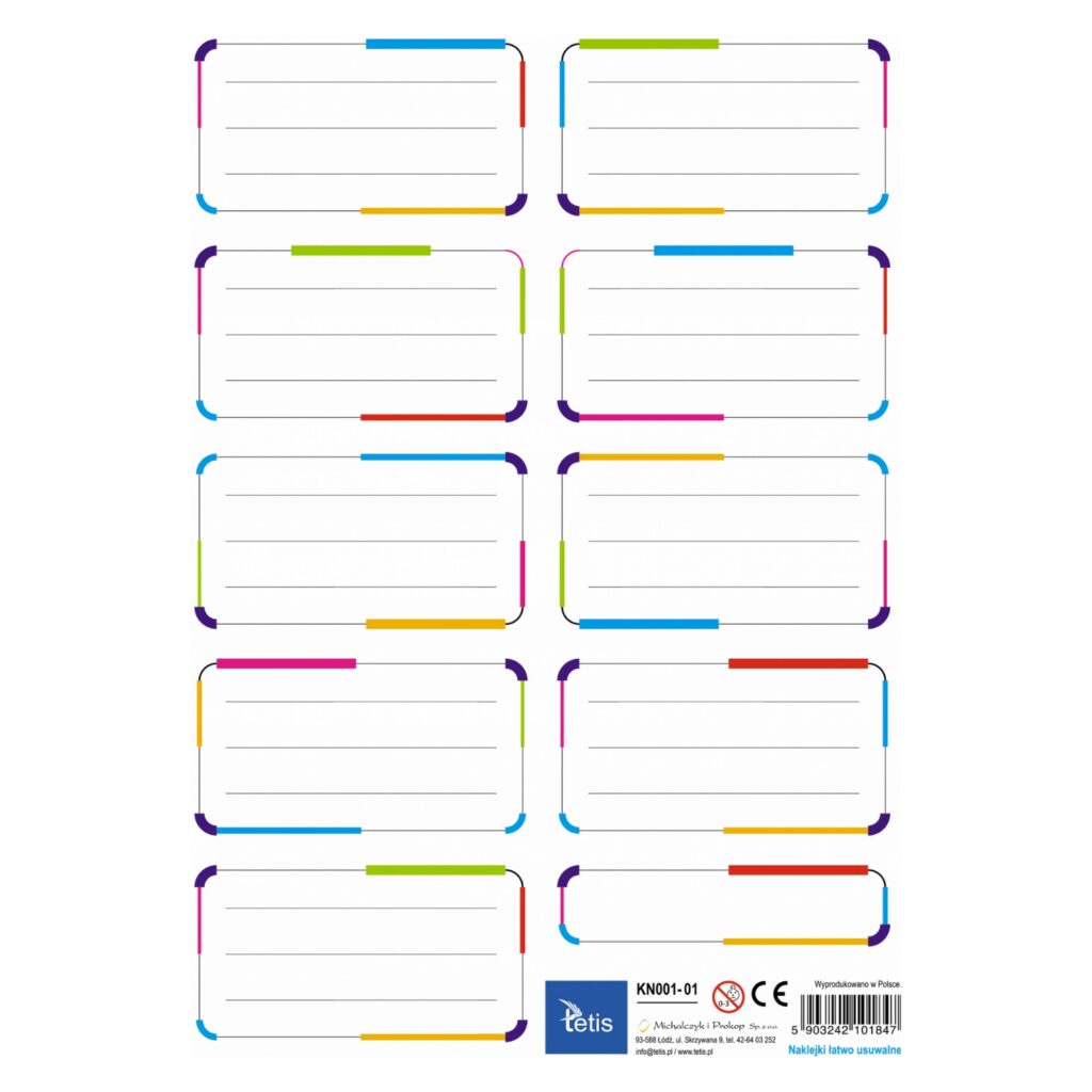 Naklejki na zeszyty i książki z zaokrąglonymi rogami, łatwo usuwalne.