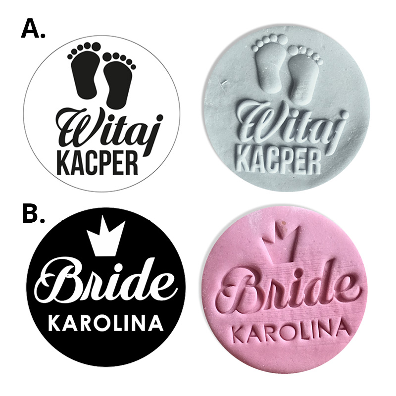 To właśnie odbity wzór sprawia, że Twoje ciastko jest tak wyjątkowe! Doskonale podkreśli charakter przyjęcia – ciastka z imionami pary młodej, ciastka z podziękowaniami, ciastka z datą urodzin, ciastka z inicjałami. Nasz stempel pomoże Ci przekazać Twoją słodką informację całemu światu. Ogranicza Cię tylko wyobraźnia.