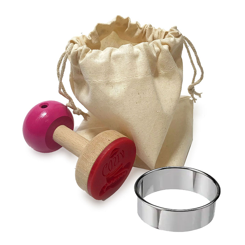 Zestaw zawiera drewniany stempel do ciastek o średnicy 6 cm z wybranym przez Ciebie wzorem odbicia wykonanym na specjalnym materiale posiadającym atest do żywności oraz okrągły wykrojnik do ciastek ze stali nierdzewnej o średnicy 6,1 cm. Wszystko zapakowane jest w ekologiczny woreczek bawełniany ze sznurkami – ułatwiający przechowywanie stempla.