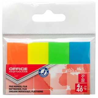 Zakładki indeksujące OFFICE PRODUCTS, PP, 20x50mm, 4×40 kart., zawieszka, mix kolorów neon