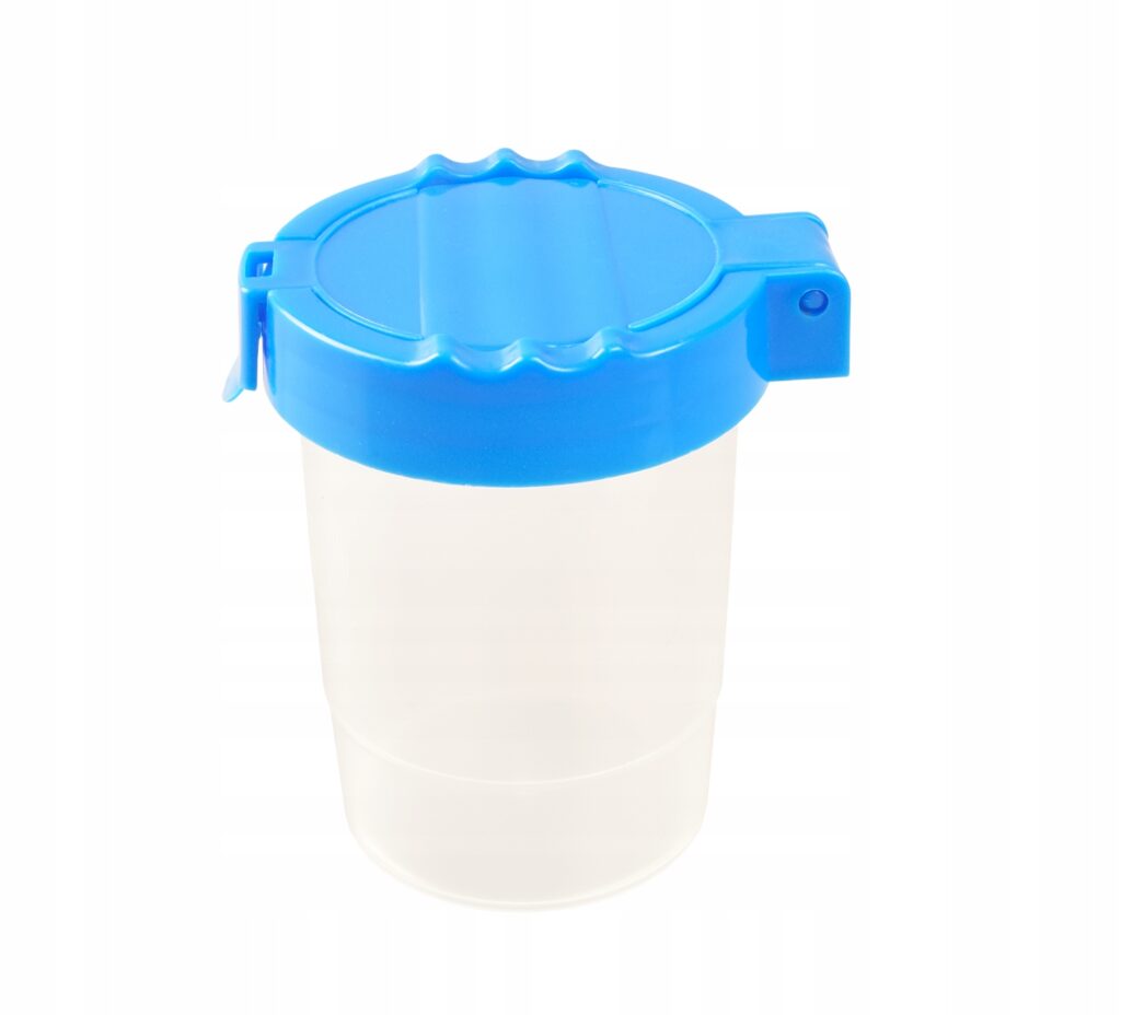 Plastikowy pojemnik do płukania pędzli z systemem lejka zabezpieczającym przed rozlaniem wody.