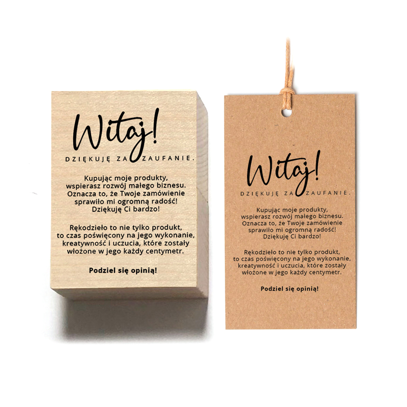 Nasze projekty zostały stworzone z myślą o osobistym przekazie producenta dla klienta, znajdziecie na nich instrukcje, podziękowania za zakup, wskazówki co do produktów, a także notki z miejscem na imię klienta, aby czuł się jeszcze bardziej wyjątkowy. Etykiety i metki z podziękowaniem za zamówienie, dołączone do produktu, to małe gesty, wywołujące pozytywne emocje, które mogą wpłynąć na poczucie więzi z Twoją marką, zwiększają także rozpoznawalność marki oraz pozytywny odbiór klienta klienta.