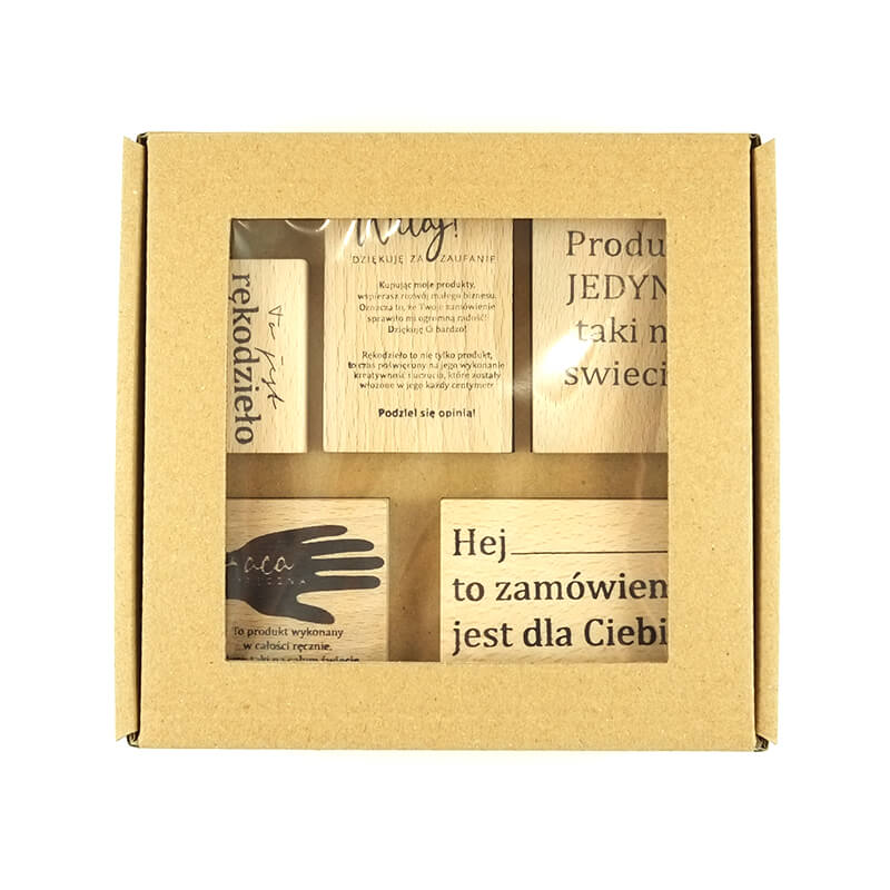 Zestaw zawierający pięć unikatowych, drewnianych stempli dla rękodzielników zapakowanych w kartonowe pudełko z okienkiem. Stemple wykonane z wysokiej jakości drewna, płytka tekstowa wykonana z gumy artystycznej w kolorze czerwonym, podklejona czerwoną pianką samoprzylepną.