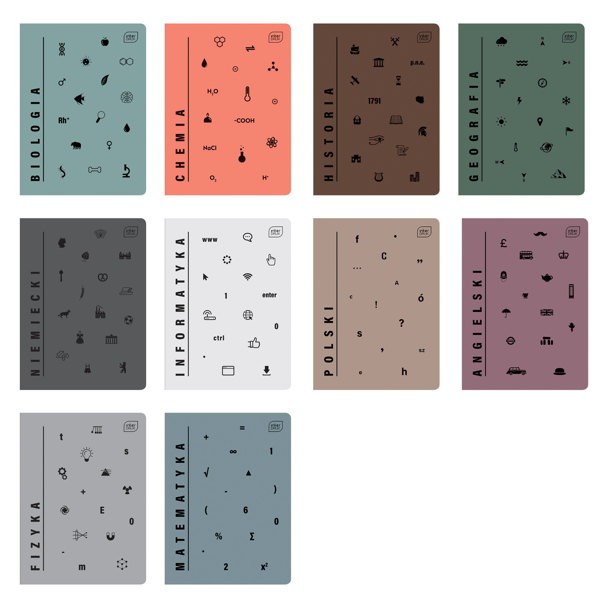 Aukcja dotyczy zestawu zeszytów tematycznych: Biologia, Historia, Religia, Geografia, Fizyka, Niemiecki, Polski, Chemia, Matematyka, Angielski